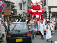 | 各町内の子供たちは、工夫を凝らした山車を引いて町内を歩き回ります。 |